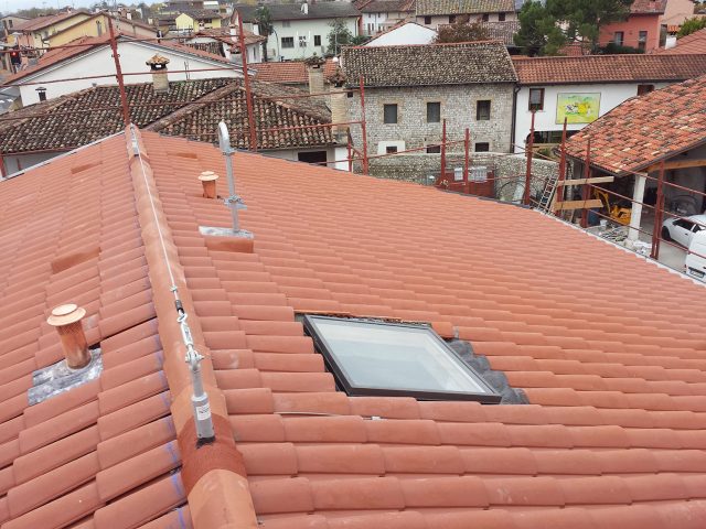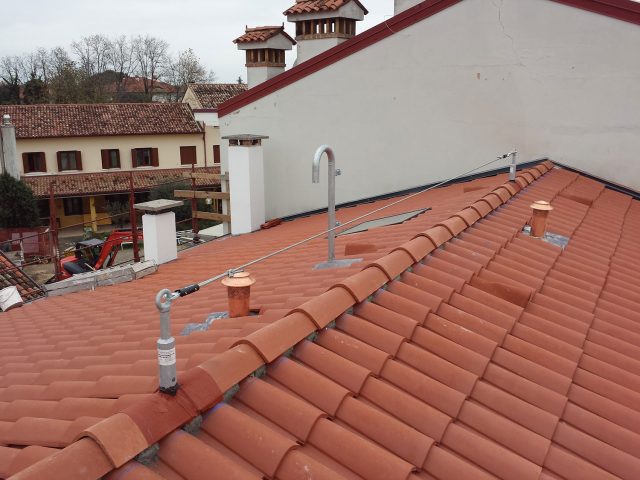 Montaggio linea di sicurezza anticaduta costituita da: finestra da tetto ad anta apribile per accesso alla copertura con dimensioni minime a norma di legge, ganci per uscita in sicurezza e linea vita a corda e pali.